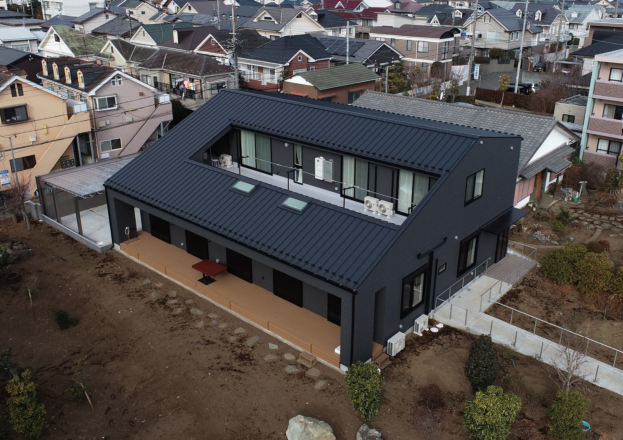 木造在来工法の2階建ての2世帯住宅です。1階が親世帯・2階は息子様世帯がお住まいになっています。外壁はサイディング張り、屋根はガルバリウム鋼板葺仕上げになっています。